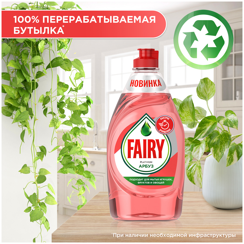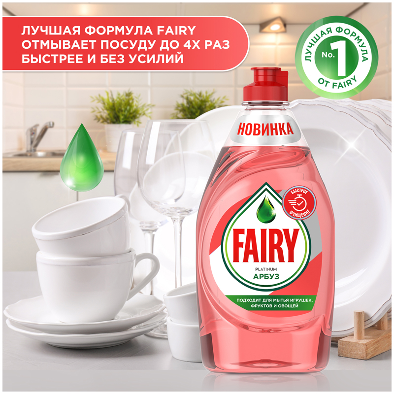 Со средством для мытья посуды Fairy Platinum Арбуз вы сможете уйти с кухни поскорее благодаря более быстрому и простому мытью посуды. Каждая капля Fairy быстро проникает и эффективно расщепляет жирный налет на посуде для безупречного результата даже при самых трудных загрязнениях.