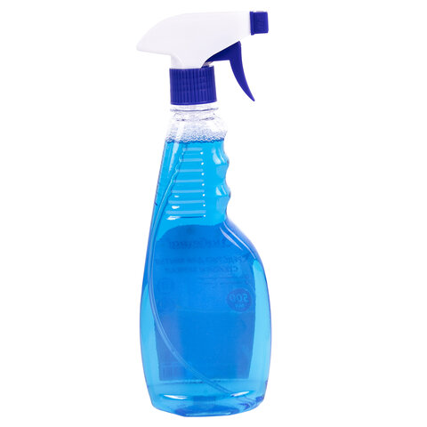 Состав: вода питьевая (30% и более), спирт изопропиловый (менее 5%), бутиловый эфир пропиленгликоля (менее 5%), АПАВ (менее 5%), моноэтаноламин (менее 5%), отдушка (менее 5%), краситель пищевой (менее 5%).