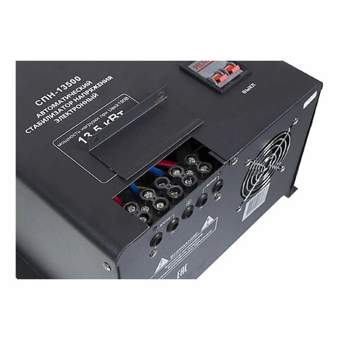 Для модели РЕСАНТА СПН-13500 максимальная мощность потребителей составляет 13,5 кВт. Если она ниже, мощность стабилизатора пересчитывается с учетом максимальной силы тока 71 А. Выходное напряжение поддерживается на уровне 220±8% В. Фильтр сетевых помех предотвращает искажение синусоиды.