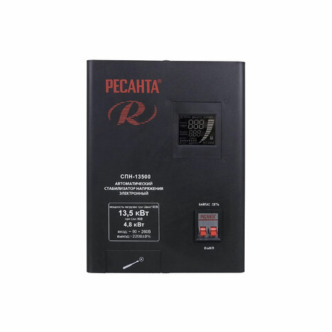 Стабилизатор РЕСАНТА СПН-13500 поможет при скачках напряжения от 90 до 260 В. Подключите к нему электроприборы общей мощностью до 13,5 кВт и защитите их от неправильного функционирования и поломки.