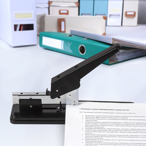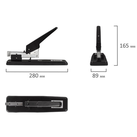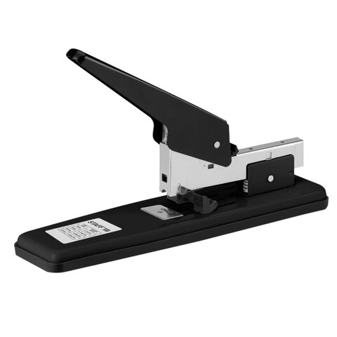 Рабочий механизм и корпус выполнены из металла черного цвета. Способен скрепить до 70 листов бумаги. Подходит для скоб № 24/6, 26/6, № 23/8, 24/8, № 23/10, № 23/13. Глубина закладки бумаги регулируется - до 72 мм. Закрытый вид сшивания. Фронтальная загрузка скоб.