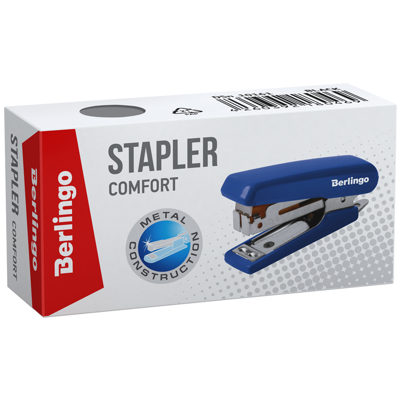 Канцелярский мини-степлер Berlingo Comfort прекрасно подходит для ежедневного использования на рабочем месте. Степлер вмещает 50 скоб размером №10, имеет 1 тип скрепления. Сшивает до 10 листов. Глубина захвата – 28 мм. <br/>У данной модели пластиковый корпус и полностью металлический механизм. Мини-степлер оснащён встроенным антистеплером. Корпус выполнен в чёрном цвете. Упакован в картонный короб. Рекомендуется использовать со скобами Berlingo.<br/>• Номер скобы: 10;<br/>• Глубина захвата: 28 мм;<br/>• Количество скрепляемых листов: 10;<br/>• Материал корпуса: пластик.