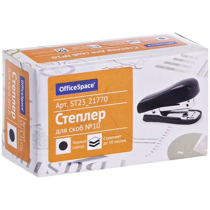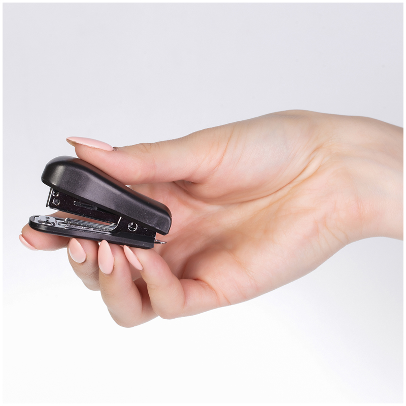 Компактный мини-степлер сшивает до 10 листов, вмещает 50 скоб №10, есть встроенный антистеплер. Пластиковый корпус, металлический механизм, цвет корпуса - черный.