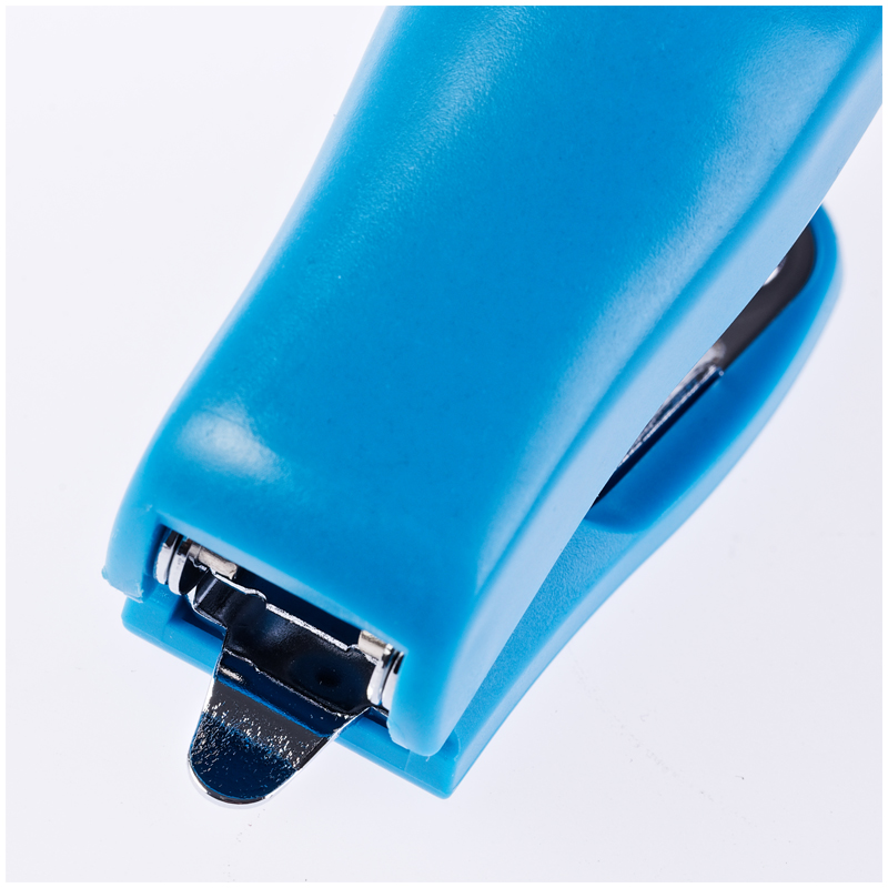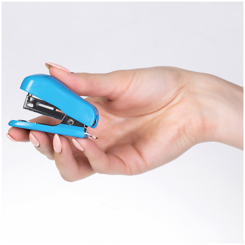 Компактный мини-степлер для скоб №24, сшивает до 12 листов, есть встроенный антистеплер. Пластиковый корпус, металлический механизм, цвет корпуса - синий.