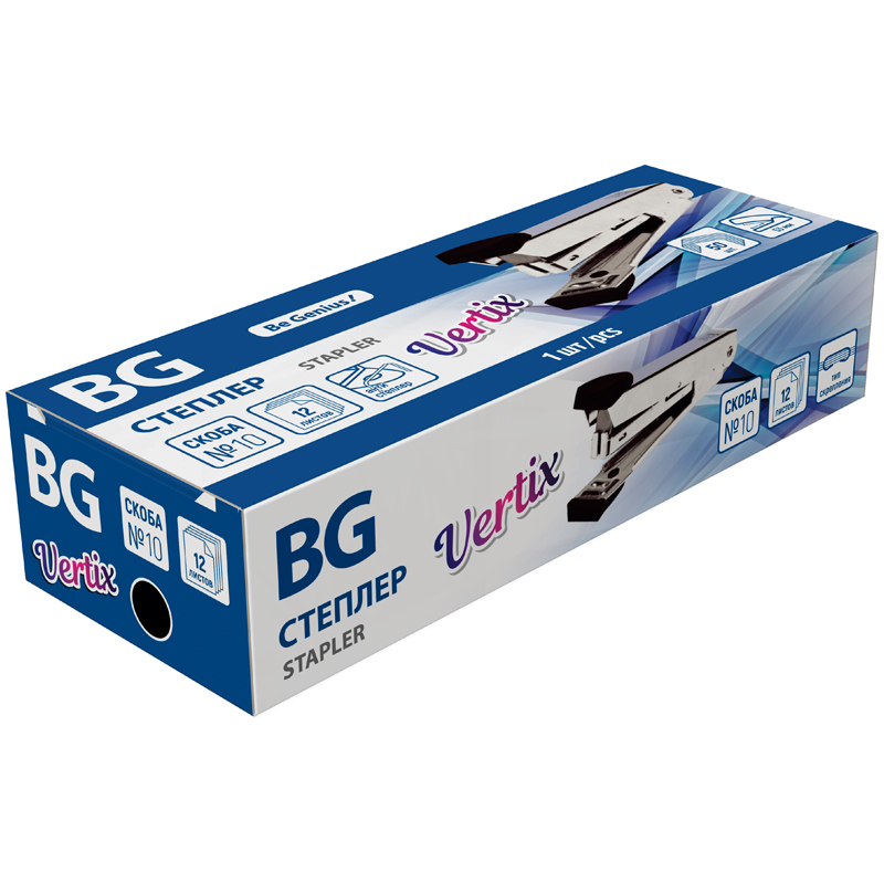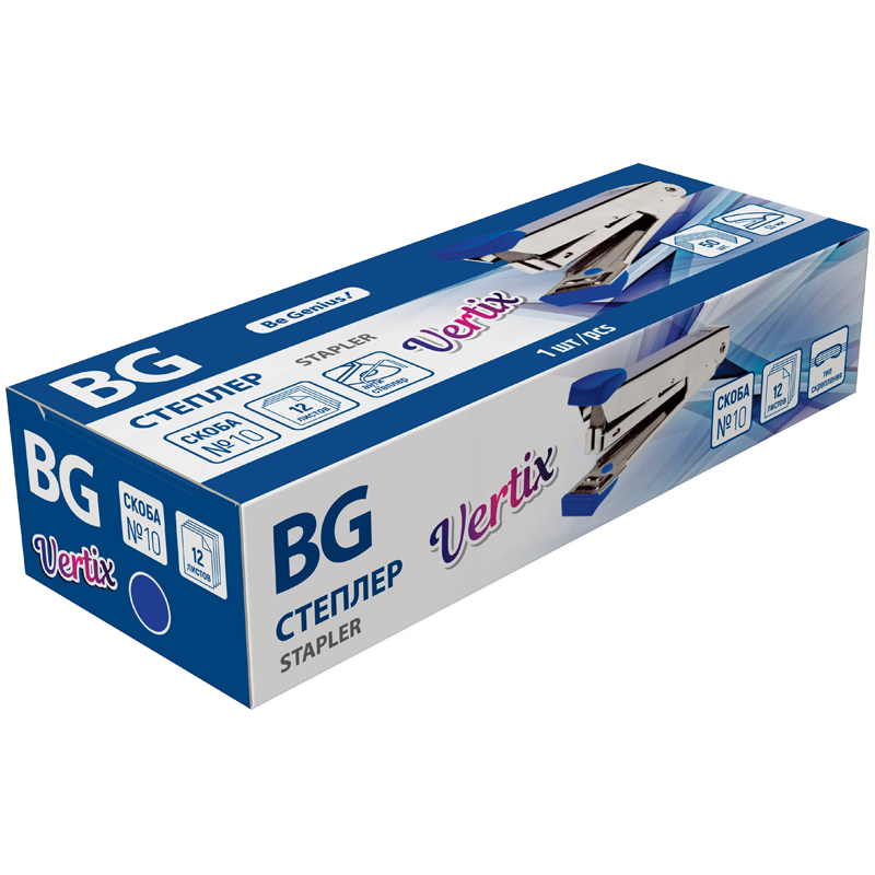 Степлер BG "Vertix" имеет цельнометаллический корпус с пластиковыми накладками.. Вместимость скоб составляет 50 шт, скобы №10, 1 тип скрепления, глубина захвата 53 мм, имеется встроенный антистеплер. Степлер скрепляет до 12 листов.
