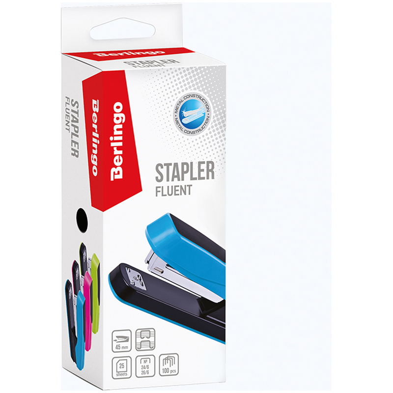 Яркий канцелярский степлер Berlingo Fluent прекрасно подходит для ежедневного использования. Степлер вмещает 100 скоб размером №24/6, 26/6, имеет 2 типа скрепления. Сшивает до 25 листов. Глубина захвата – 45 мм.