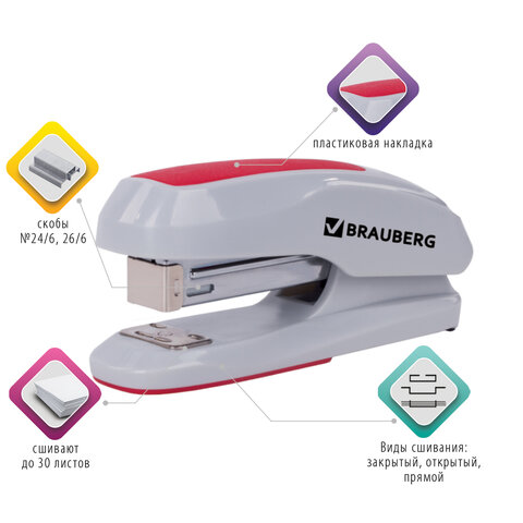 Способен скрепить до 30 листов. Подходящий размер скоб №24/6, 26/6. Глубина закладки бумаги - 55 мм. Виды сшивания: закрытый, открытый и прямой. Резиновая накладка предотвращает скольжение степлера по столу. Корпус изготовлен из пластика. За счет компактных размеров не займет на рабочем столе много места, а классические цвета и дизайн будут отлично дополнять любой интерьер.