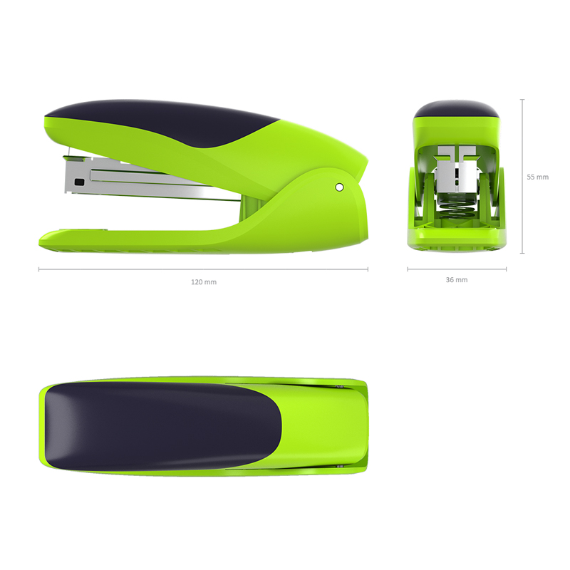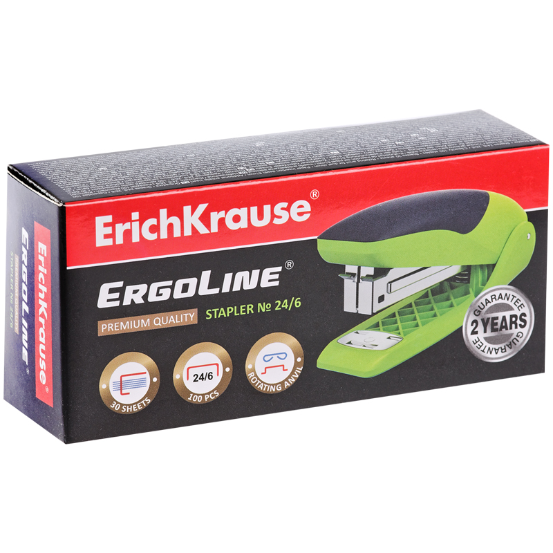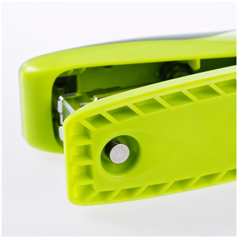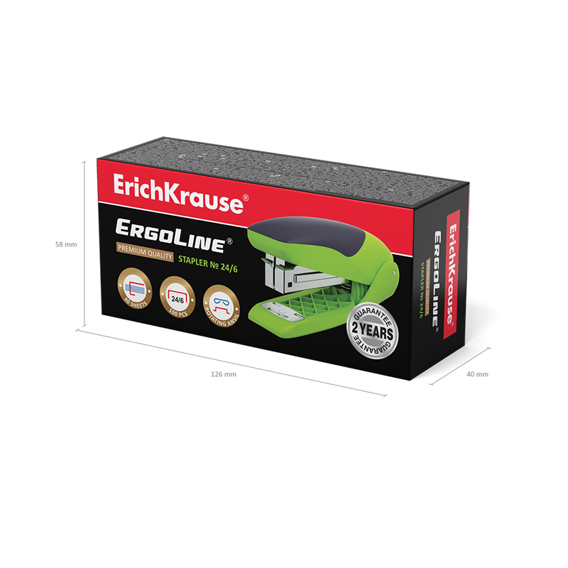 Cтеплер изготовлен из ударопрочного пластика с высококачественным стальным механизмом. Имеет два режима скрепления: постоянное и временное. На корпусе предусмотрена резиновая противоскользящая вставка. Имеет цельнометаллический механизм подачи скоб. Вмещает до 100 скоб №24/6 и до 140 скоб №26/6. Пробивает до 30 листов. Глубина закладки бумаги до 61 мм