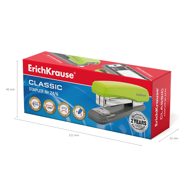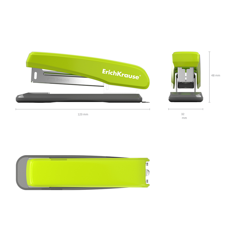 Cтеплер со встроенным металлическим антистеплером изготовлен из ударопрочного пластика с высококачественным стальным механизмом. Имеет два режима скрепления: постоянное и временное. Имеет цельнометаллический механизм подачи скоб. Вмещает до 80 скоб №24/6 и до 100 скоб №26/6. Пробивает до 25 листов. Глубина закладки бумаги до 65 мм. Основание степлера имеет металлическое усиление, а так же резиновые противоскользящие вставки