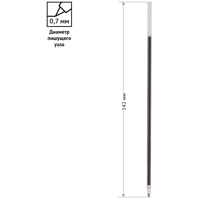 Предназначен для замены исписанного стержня шариковой ручки. Длина стрежня - 142 мм, диаметр пишущего узла - 0,7 мм.