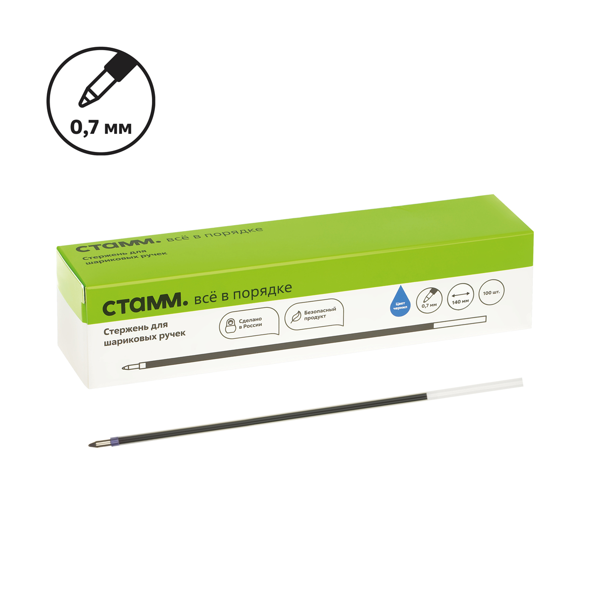 Стержень шариковый «СТАММ» предназначен для замены исписанного стержня шариковой ручки. Толщина линии – 0,5 мм, диаметр пишущего узла – 0,7 мм. Длина стержня – 140 мм. Синие чернила пониженной вязкости на масляной основе обеспечивают мягкое и плавное письмо, не текут и не мажутся. Износостойкий наконечник и большой запас чернил позволяют долго использовать ручку для ведения записей. Длина линии письма в два раза больше стандартной – 1 500 м. В картонной упаковке – сто стержней.