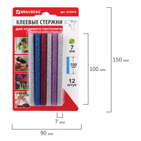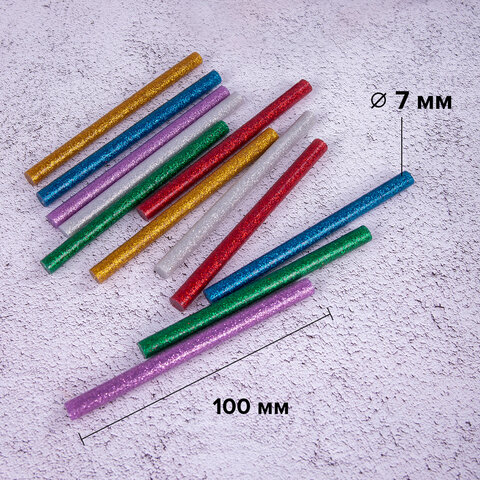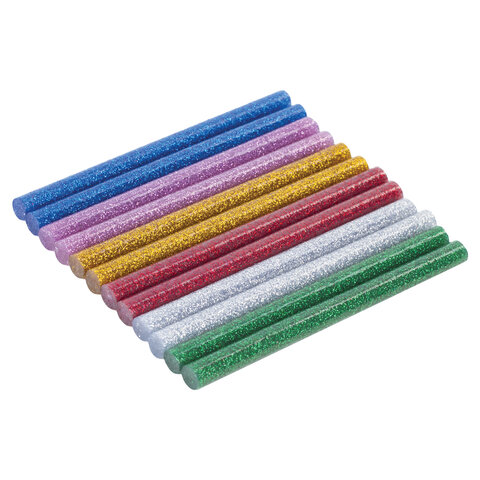 Клеевые стержни, диаметр 11 мм, длина 100 мм, цветные (ассорти), С БЛЕСТКАМИ, КОМПЛЕКТ 12 шт., 6 цветов, BRAUBERG, 670321