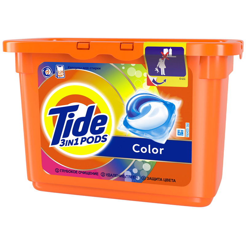 Капсулы для машинной стирки Tide "Color" — это потрясающая эффективность всего в одной капсуле. Кристальная чистота и никаких следов. Попробуйте инновационное средство для стирки от Tide — Tide ВСЁ в 1 PODS. Каждая капсула состоит из 3 секций — таким образом, ее ингредиенты не смешиваются до начала стирки. При контакте с водой специальная инновационная пленка растворяется, и капсула начинает свое действие: очищает, удаляет пятна, придает яркость и освежает; она эффективна уже при 20 °С. Одной капсулы хватает, чтобы полностью выстирать полный барабан грязных вещей. Капсулы для машинной стирки Tide "Color" — это надежный выбор для удивительно эффективной стирки. Используйте вместе с кондиционерами Lenor, которые придают белью еще больше мягкости и свежести. ВНИМАНИЕ. Продукт может быть опасен. Берегите капсулы Tide от детей.