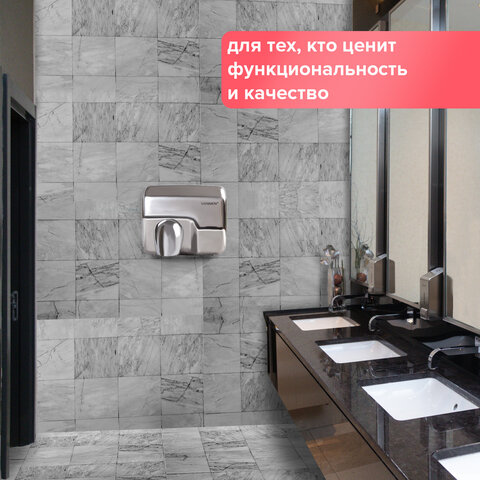 Мощность 2300 Вт обеспечивает время сушки рук всего за 15 секунд. Стандарт IPX1 гарантирует защиту от брызг. Включается и выключается сушилка автоматически при помощи инфракрасного сенсора. Эргономичный дизайн и надежная конструкция. Корпус из нержавеющей стали обеспечивает долговечность и антивандальную безопасность устройства. В комплект поставки входит набор для крепления к стене.