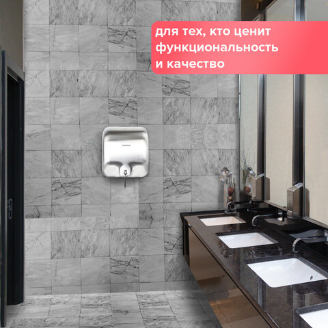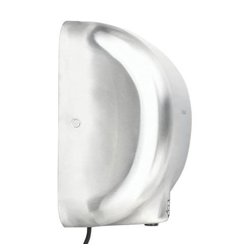 Мощность 1800 Вт обеспечивает время сушки рук за 15 секунд. Стандарт IPX1 гарантирует защиту от брызг. Модель относится к современному скоростному типу электросушителей. Высокопроизводительный мотор нагнетает мощный поток воздуха, в результате чего руки высушиваются очень быстро. Несомненным плюсом данной модели является наличие корпуса из нержавеющей стали, что обеспечивает повышенную антивандальную безопасность устройства. Данная модель идеально подойдет для мест со средней и высокой проходимостью. В комплект входит набор для монтажа: шурупы с пластиковыми дюбелями и шаблон установки для удобства разметки точек крепления.
