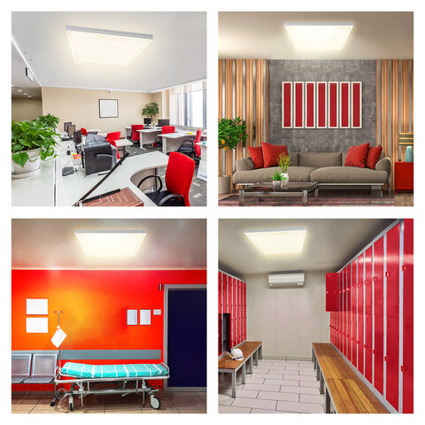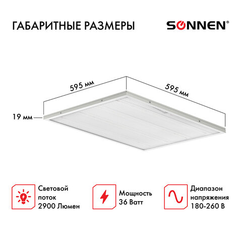 Прибор SONNEN освещает пространство со световым потоком, равным 2900 Лм, при цветовой температуре, составляющей 4000 К, благодаря чему подходит для обслуживания большого помещения. Его размеры составляют 595x19x595 мм.