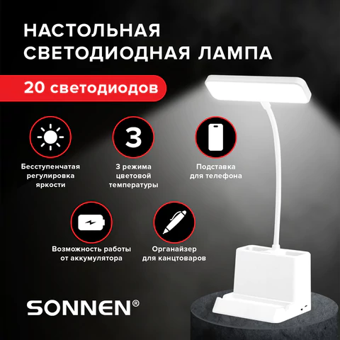 Интегрированный органайзер поможет поддерживать порядок на столе, а специальная подставка для телефона – удобно держать устройство под рукой. Встроенный аккумулятор обеспечит бесперебойную работу светильника.