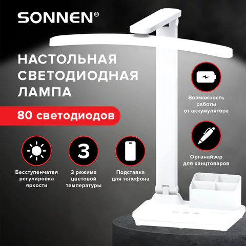 Интегрированный органайзер поможет поддерживать порядок на столе, а специальная подставка для телефона – удобно держать устройство под рукой. Встроенный аккумулятор обеспечит бесперебойную работу светильника.