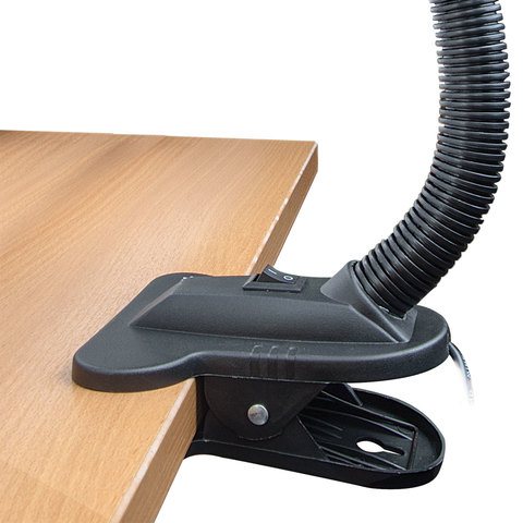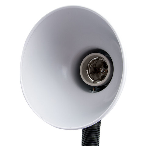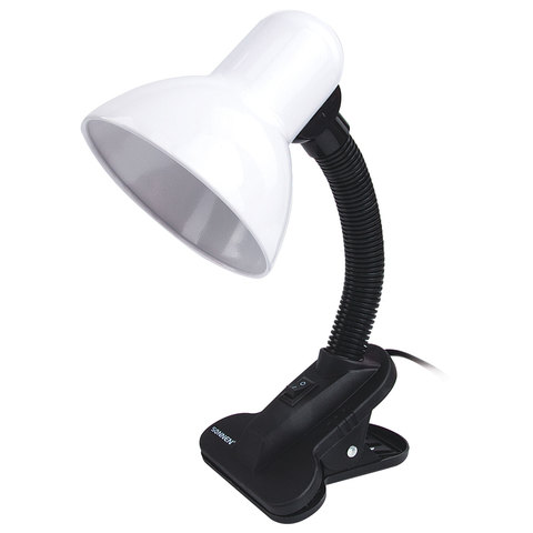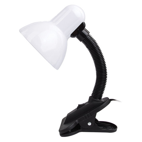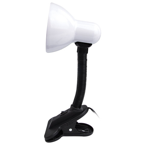 Для светильника высотой 30 см подходит любая технология бытовых ламп (накаливания, люминисцентная, светодиодная) с цоколем Е27, благодаря чему можно самостоятельно выбрать яркость и оттенок света. При использовании лампы накаливания, максимальная мощность не должна превышать 40 Вт. Корпус из пластика представлен в предельно простом черно-белом дизайне, благодаря которому он гармонично впишется в офисный или домашний интерьер. Лампа крепиться с помощью прищепки.