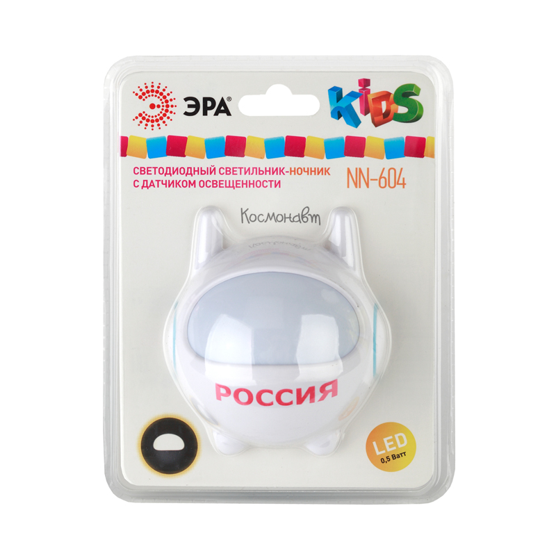 Ночник "Космонавт" с надписью "РОССИЯ", со светодиодами (LED) в качестве источников света и встроенным датчиком освещенности (включается автоматически, когда становится темно). Упаковка позволяет проверить работу ночника не доставая его из блистера, нужно только включить его в розетку и прикрыть датчик освещенности рукой.