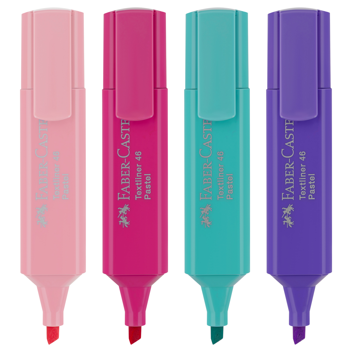 Набор тестовыделителей "46 Pastel" от немецкого производителя Faber-Castell можно использовать не только для выделения и подчеркивания, но и как маркеры для творчества.<br/>Чернила на водной основе отлично подходят для всех типов бумаги. <br/>Скошенный пишущий узел позволяет создавать линии различной ширины: 1, 2 и 5 мм. Пишущий узел изготовлен из прочного фибрового волокна, что обеспечивает надёжность и долгий срок службы. <br/>Faber-Castell использует экологический подход к производству своей продукции: данные текстовыделители изготовлены из 100% переработанного пластика. <br/>Форма корпуса: прямоугольная классическая.<br/>Набор состоит из 4 цветов нежных пастельных оттенков
