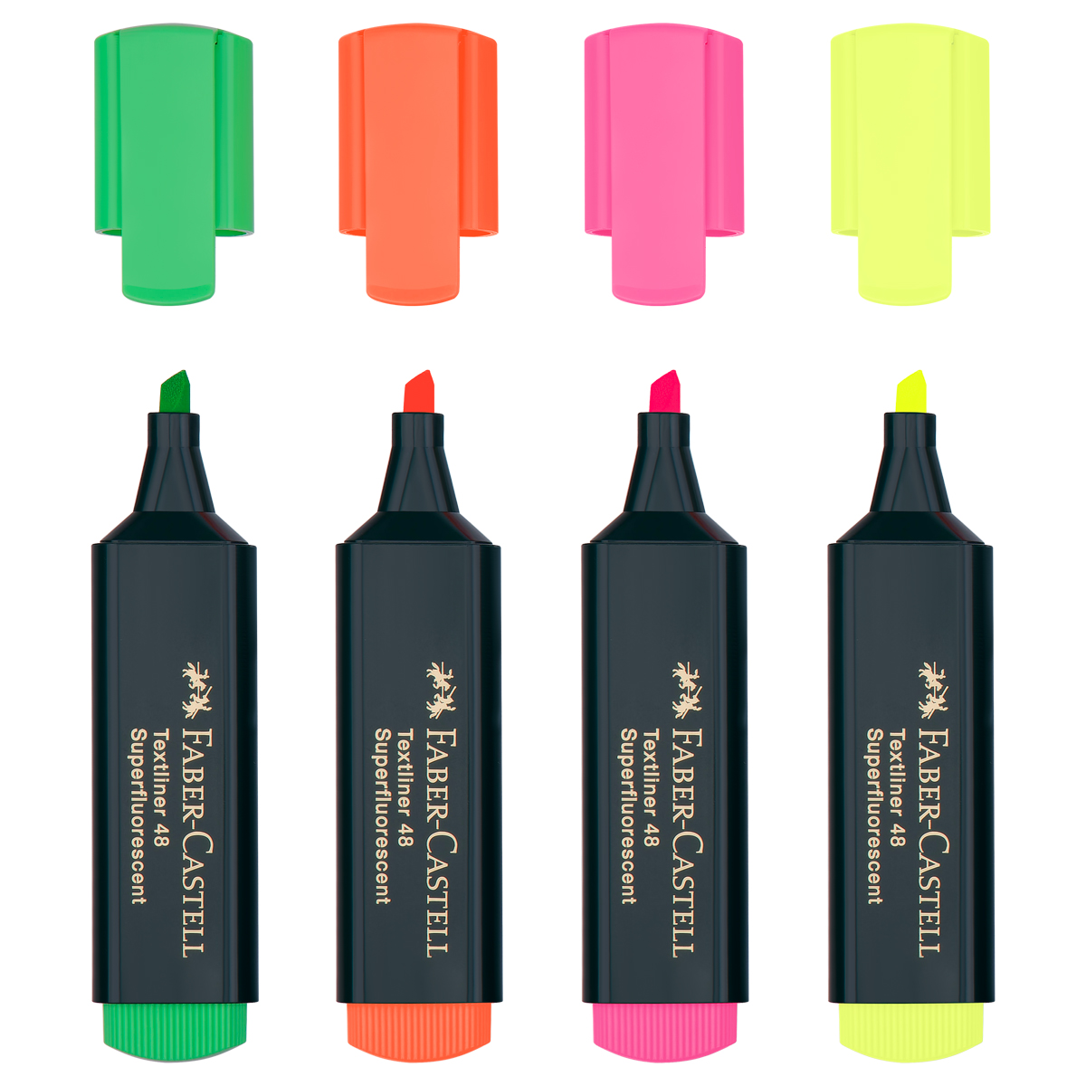 Набор текстовыделителей "48 Superfluorescent" от немецкого производителя Faber-Castell в классическом прямоугольном корпусе. Суперфлуоресцентные чернила на водной основе отлично подходят для всех типов бумаги. Не размазываются. Долго не выцветают. Продукт можно использовать не только для выделения и подчеркивания, но и как маркеры для творчества. Скошенный пишущий узел позволяет создавать линии различной ширины: 1, 2 и 5 мм. Он изготовлен из прочного фибрового волокна, что обеспечивает надёжность и долгий срок службы. Набор состоит из 4 цветов.