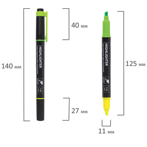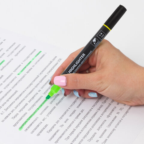 Двусторонний текстовыделитель неоновых цветов - желтый/зеленый - обладает круглой формой корпуса диаметром 11 мм. Корпус тектовыделителя оснащен удобной зоной захвата. Скошенный наконечник имеет толщину линии письма от 1 до 4 мм, что обеспечивает удобство при работе с текстом, напечатанным мелким шрифтом, или таблицами. Текстовыделитель обладает экономным расходом чернил. Светоустойчивые чернила на водной основе не выцветают даже на открытом солнце и не размазываются в процессе использования. Изделие не перезаправляется. Цвет клипа соответствует цвету чернил.