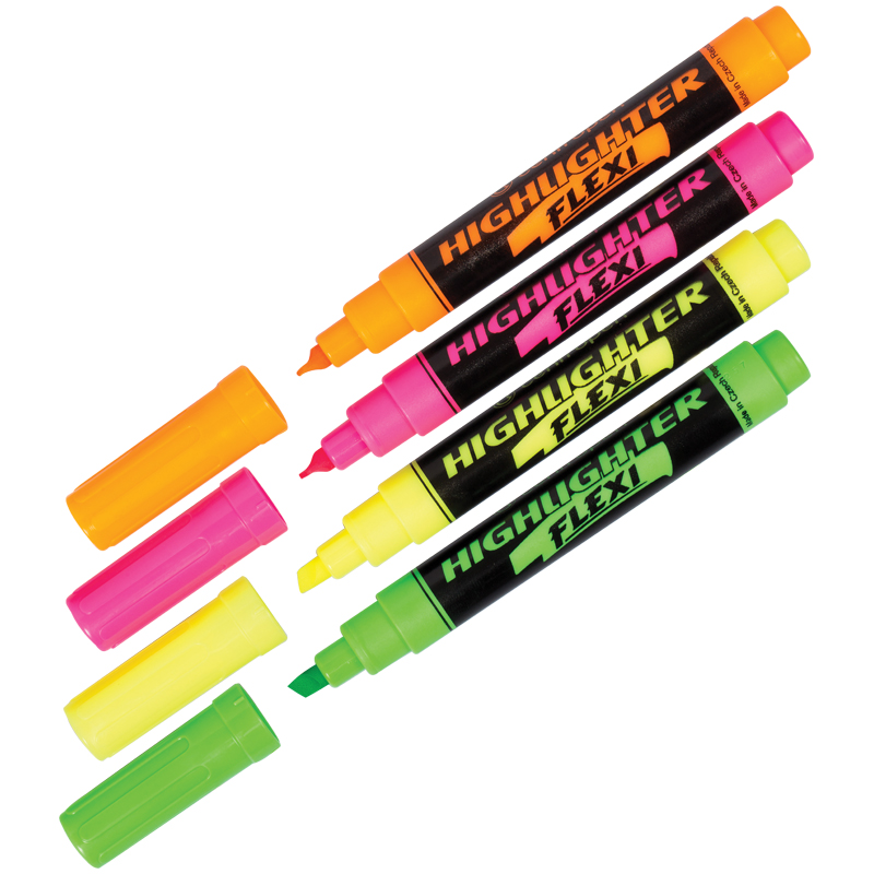 Набор маркеров текстовыделителей FLEXI: желтый, зеленый, оранжевый, розовый. Повышенный объем чернил, специальный супергибкий наконечник. Флуоресцентные пигментные чернила (неоновые оттенки), устойчивые к ультрафиолетовому воздействию, подходят для всех видов бумаги. Клиновидный наконечник, толщина линии 1-5 мм.