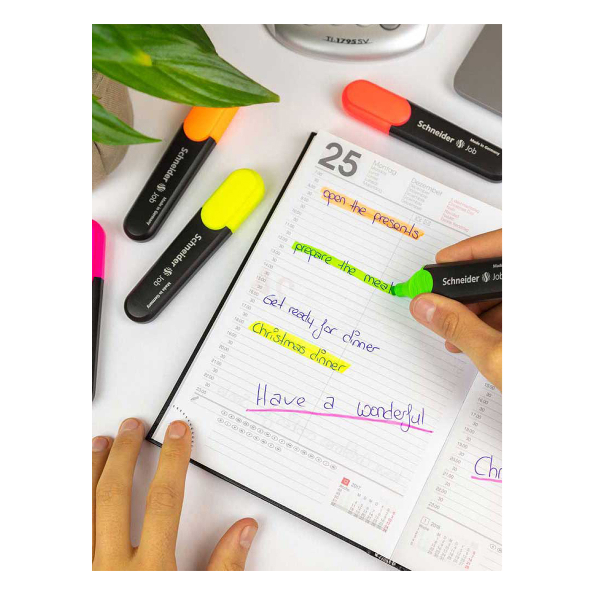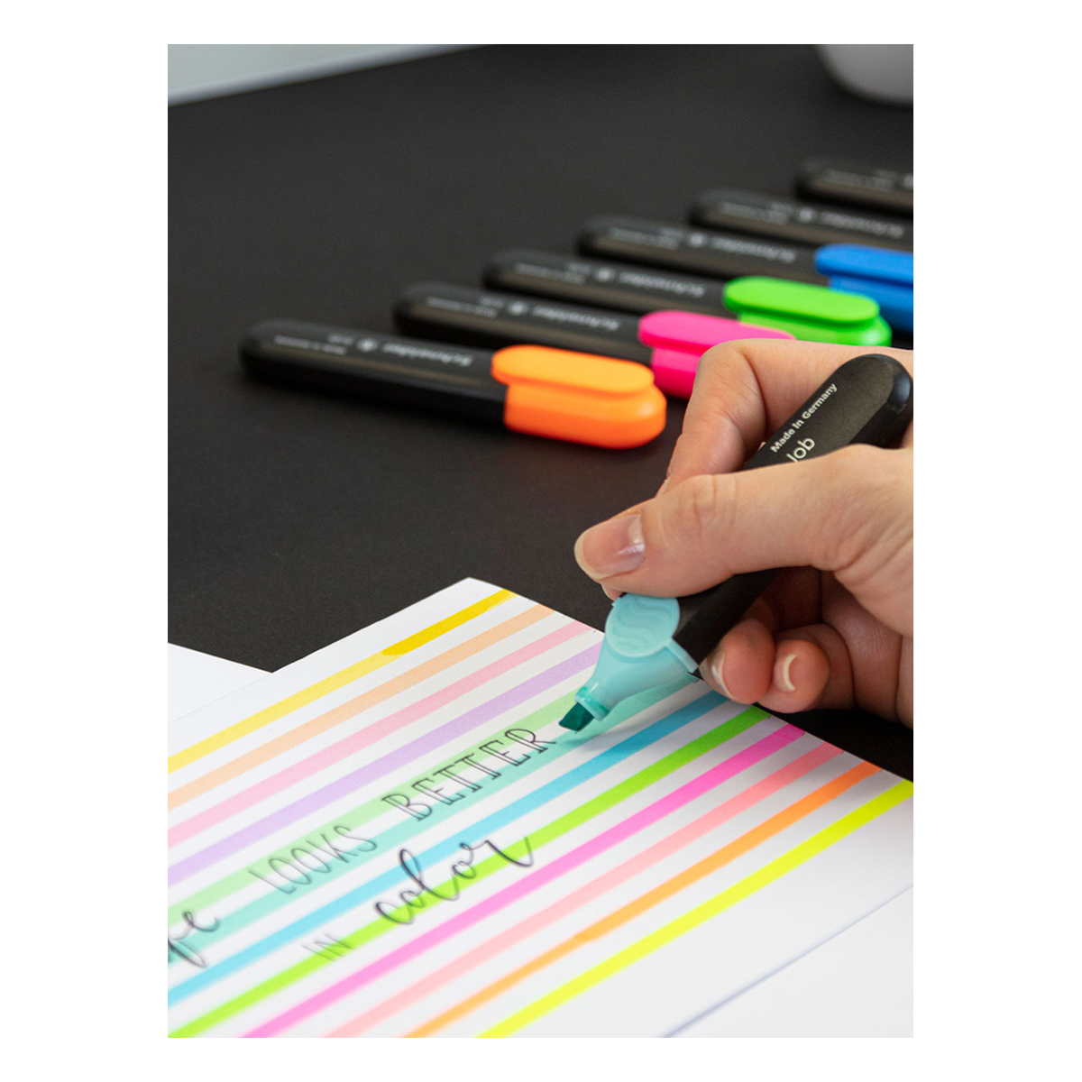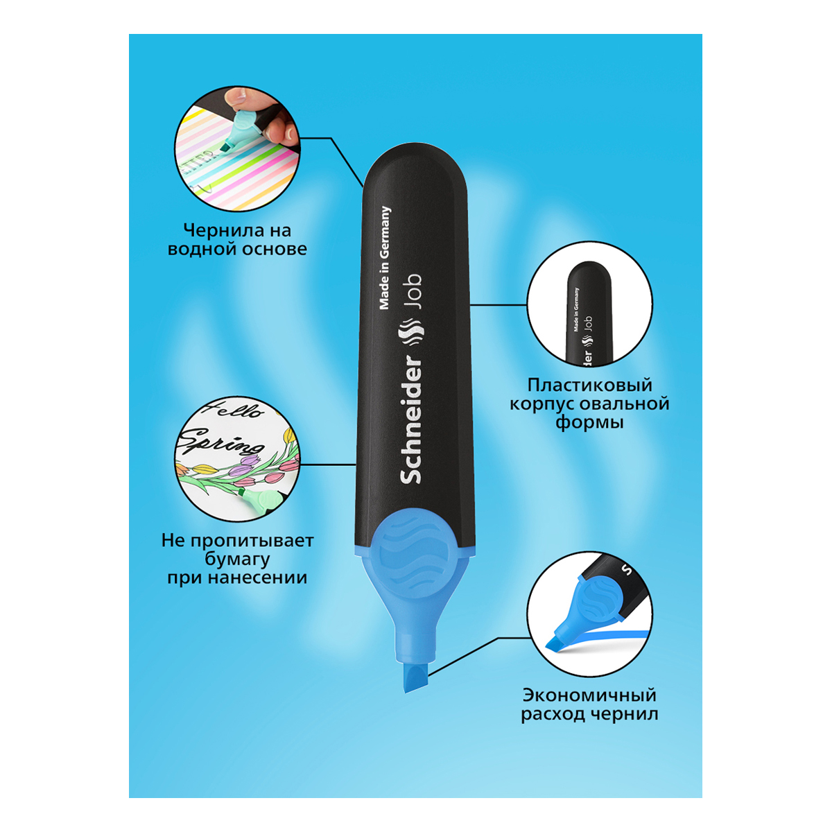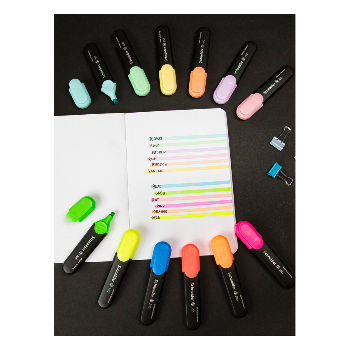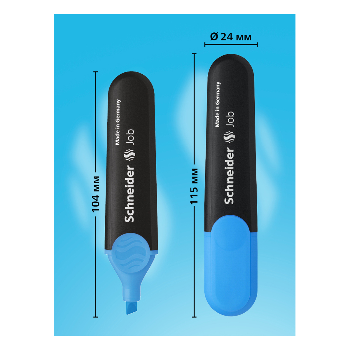 Универсальные текстовыделители Schneider Job имеют светостойкие чернила яркого неонового цвета на водной основе. Толщина линии варьируется от 1 до 5 мм. В наборе 6 цветов: жёлтый, зелёный, коралловый, оранжевый, розовый, голубой. Schneider Job подходит для различных типов бумаги. Текстовыделители представлены со скошенным наконечником. Диаметр овального пластикового корпуса составляет 24 мм. Цвет колпачка и элементов корпуса соответствует цвету чернил. Упакован в прозрачный чехол.