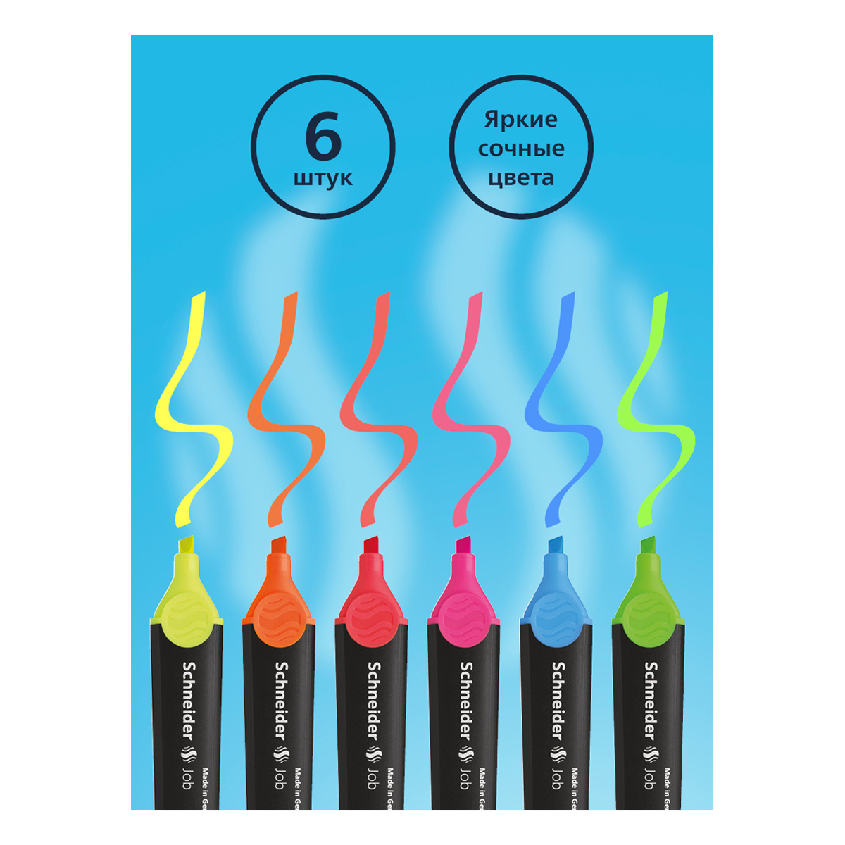 Универсальные текстовыделители Schneider Job имеют светостойкие чернила яркого неонового цвета на водной основе. Толщина линии варьируется от 1 до 5 мм. В наборе 6 цветов: жёлтый, зелёный, коралловый, оранжевый, розовый, голубой. Schneider Job подходит для различных типов бумаги. Текстовыделители представлены со скошенным наконечником. Диаметр овального пластикового корпуса составляет 24 мм. Цвет колпачка и элементов корпуса соответствует цвету чернил. Упакован в прозрачный чехол.<br/>• Количество цветов: 6;<br/>• Толщина линии письма: 1-5 мм;<br/>• Тип наконечника: скошенный<br/>• Основа чернил: водная