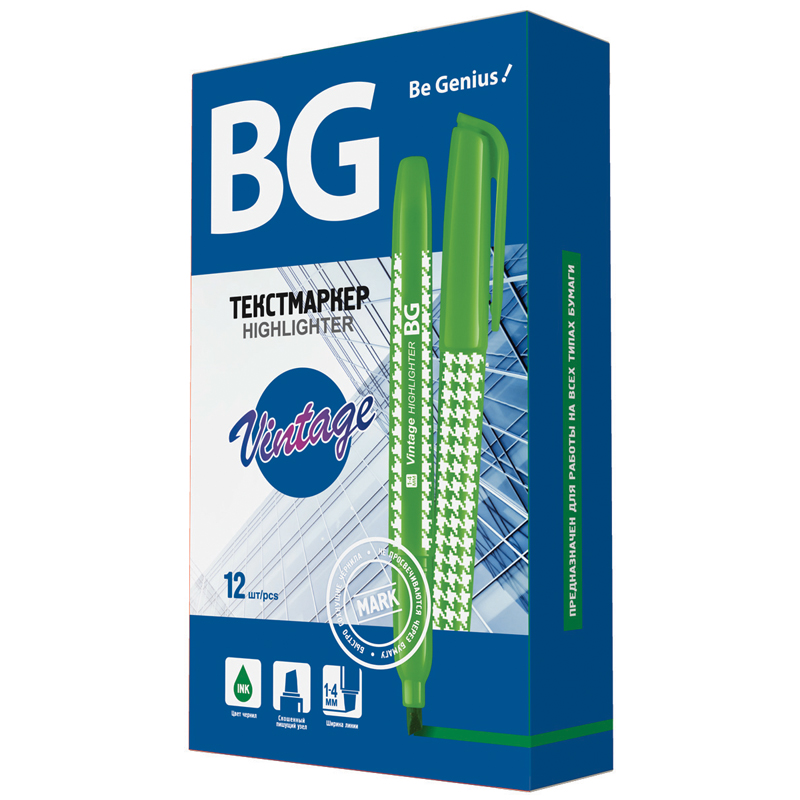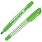 Текстовыделители с флуоресцентными чернилами на водной основе. Выполнены в оригинальном корпусе графитового цвета с сочетанием матовых и глянцевых поверхностей. Яркие элементы колпачка и нанесение соответствуют цвету чернил. Длина непрерывной линии письма - 300 метров. Скошенный наконечник с толщиной линии от 1 до 5 мм. Цвет чернил - зеленый. Упакованы в картонную коробку по 12 штук.