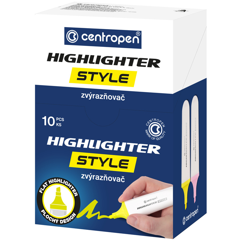 Стильный текстовыделитель Centropen Style в белом корпусе и желтыми чернилами подойдет для выделения,подчеркивания текста на любом виже бумаги. Скошенный пишущий узел, ширина линии 1-4,6 мм.
