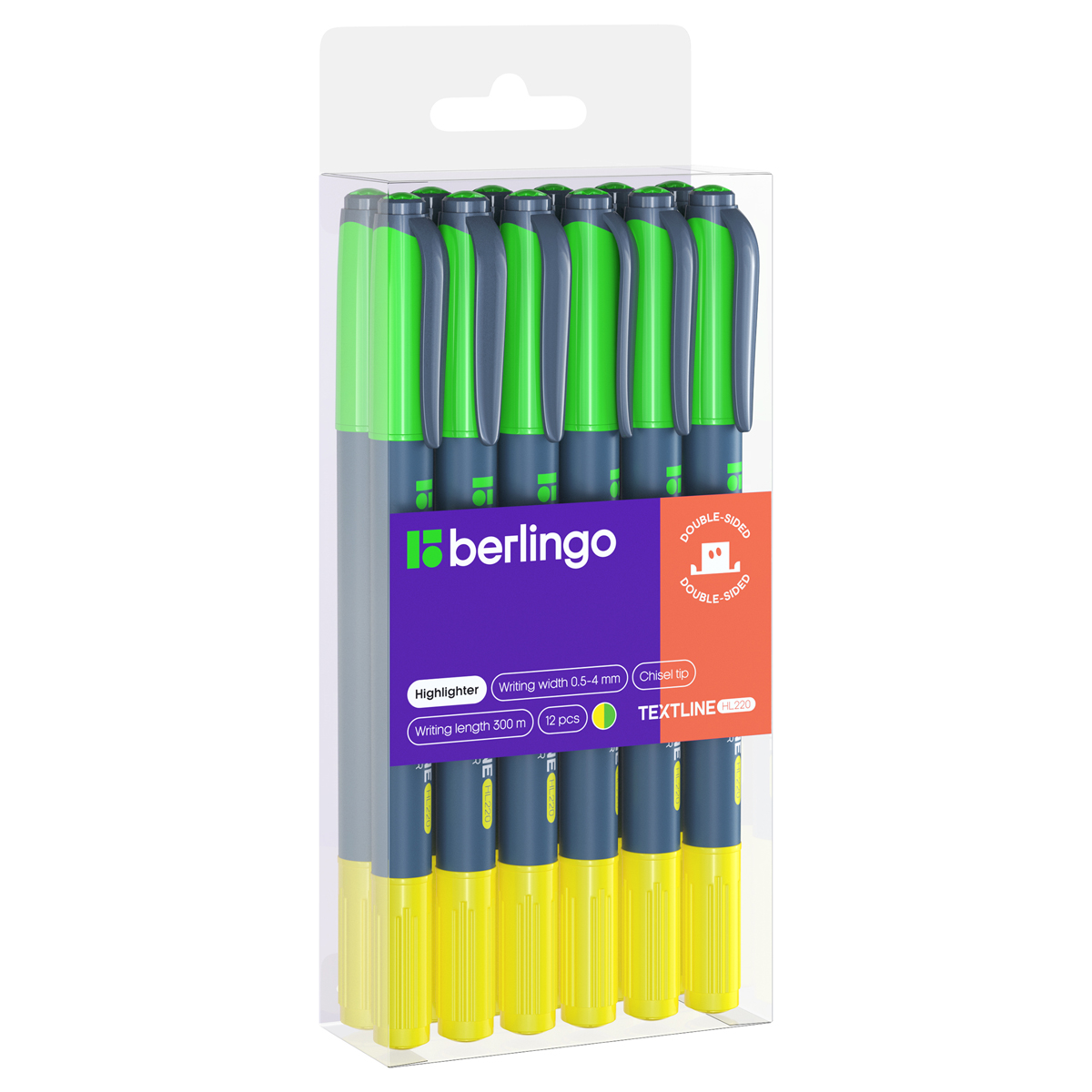 Двусторонний текстовыделитель Berlingo Textline HL220 с неоновыми чернилами на водной основе – отличный инструмент для выделения важного в тексте. Сочетает в себе классический неоновый желтый и зеленый. Ширина линии письма может варьироваться от 0,5 до 4 мм. Выделители упакованы по 12 штук в удобный пластиковый бокс с европодвесом. Подходит для любого типа бумаги, включая бумагу для факсов. Мягкий пишущий узел обеспечивает комфорт при использовании и равномерное распределение краски без подтеков. Круглый корпус из пластика имеет диаметр 12 мм. Удобный пластиковый клип позволяет легко закрепить текстовыделители на кармане рубашки, ежедневнике или планшете. Колпачки каждого выделителя по цвету совпадают с пишущим узлом, что значительно облегчает поиск нужного оттенка. <br/>• Цвет чернил: зеленый/желтый;<br/>• Ширина линии письма: 0,5-4 мм;<br/>• Количество штук в упаковке: 12 штук.