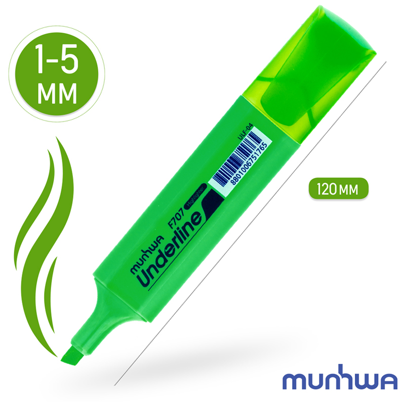 Текстовыделитель MunHwa "UnderLine" . Яркий неоновый цвет подходит для выделения в тексте, ежедневнике, тетради. Сделает акценты на самые важные моменты. <br/>Прочный фибровый наконечник не западает в корпус и сохраняет форму на протяжении всего срока службы текстовыделителя. <br/>Текстовыделитель до 5 дней не высыхает без колпачка, а при закрытом колпачке в течении 30 минут полностью восстанавливает свои свойства! <br/>Обладает светостойкими чернила, которые до 5 недель не выгорают на солнце. <br/>Скошенный пишущий узел позволяет наносить линии толщиной от 1 до 4 мм. Цвет чернил - зеленый.<br/>Почувствуй лето круглый год вместе с текстовыделителями MunHwa!