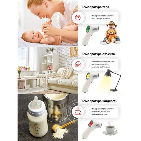 Инфракрасный бесконтактный термометр идеально подойдет как для домашнего использования, так и для организаций любого профиля: офисы и предприятия, общественный транспорт, такси, кафе, бары и рестораны. Простой, точный и бесконтактный способ измерения температуры тела удобен при необходимости одновременного обследования большого количества людей.