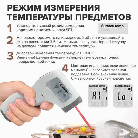 Бесконтактный инфракрасный термометр SONNEN NIT-2 имеет следующие режимы: