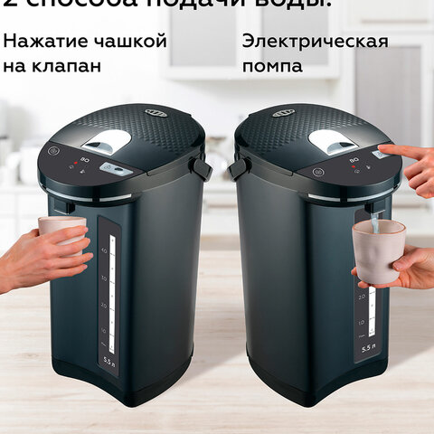Объединяя в себе функции чайника и термоса, данный прибор обладает внушительным объемом 5,5 литров, что позволяет использовать его для большой семьи или офиса.