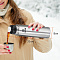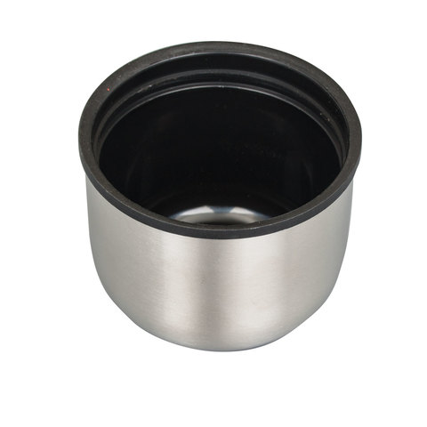 Термос диаметром 8 см и высотой 33 см выполнен в серебристом цвете. Оснащен специальной кнопкой, позволяющей наливать напитки, не отвинчивая пробку.