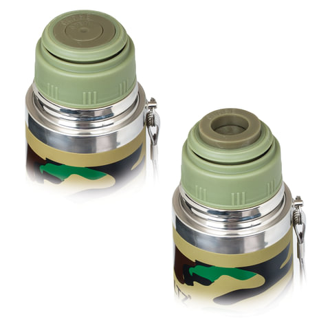 Термос диаметром 6,5 см и высотой 25 см оснащен специальной кнопкой, позволяющей наливать напитки, не отвинчивая пробку.