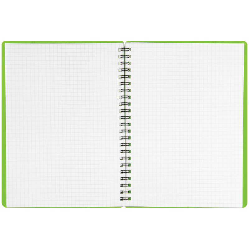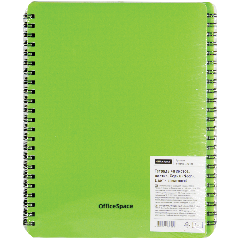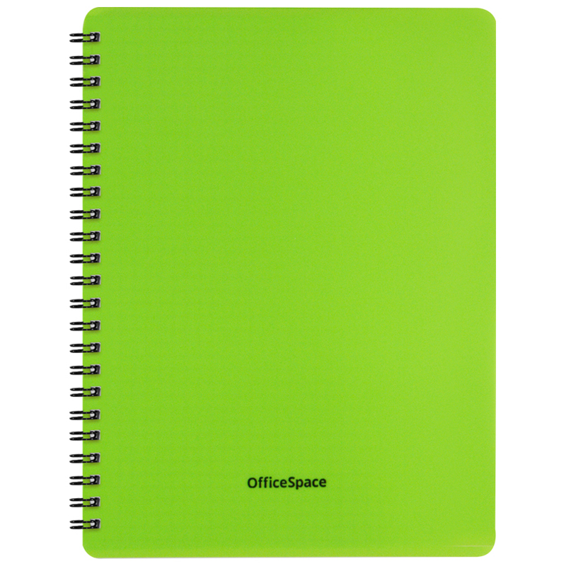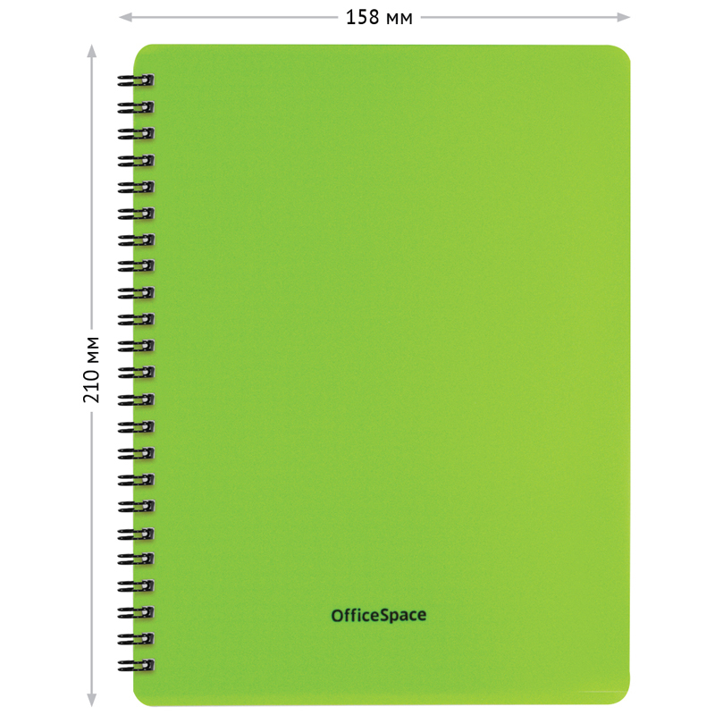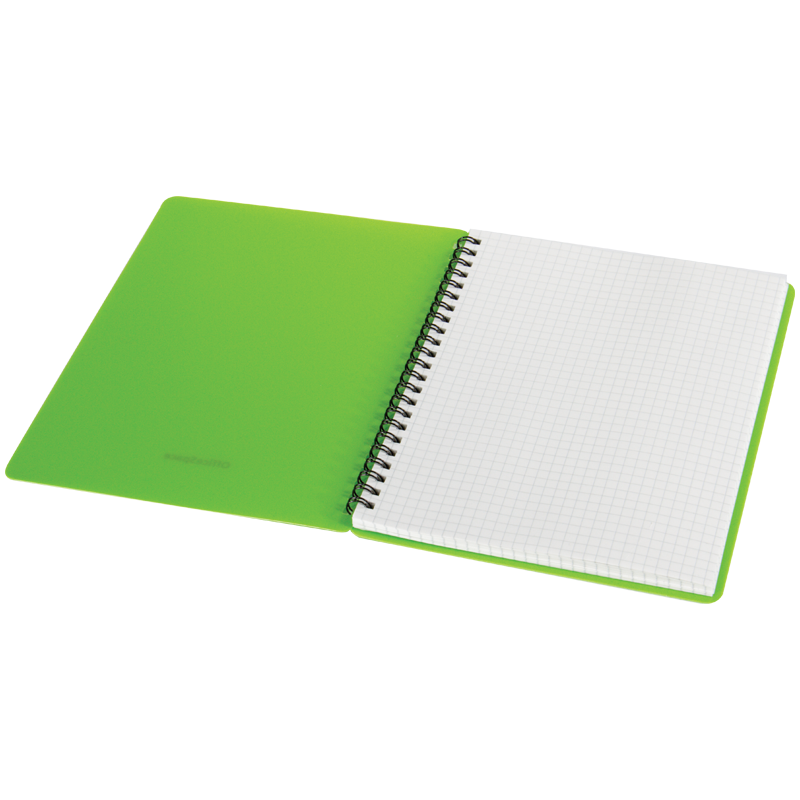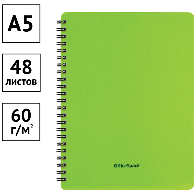 Тетрадь общая формата А5. Обложка из высококачественного износостойкого матового пластика с фактурой «песок». В блоке 48 листов в клетку. Бумага офсетная плотностью 60-65 г/м². Цвет линовки — серый. Скругленные уголки обложки. Тип скрепления — евроспираль.