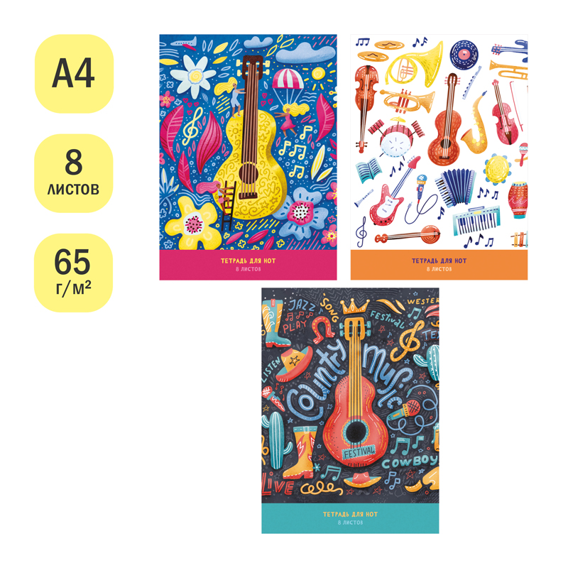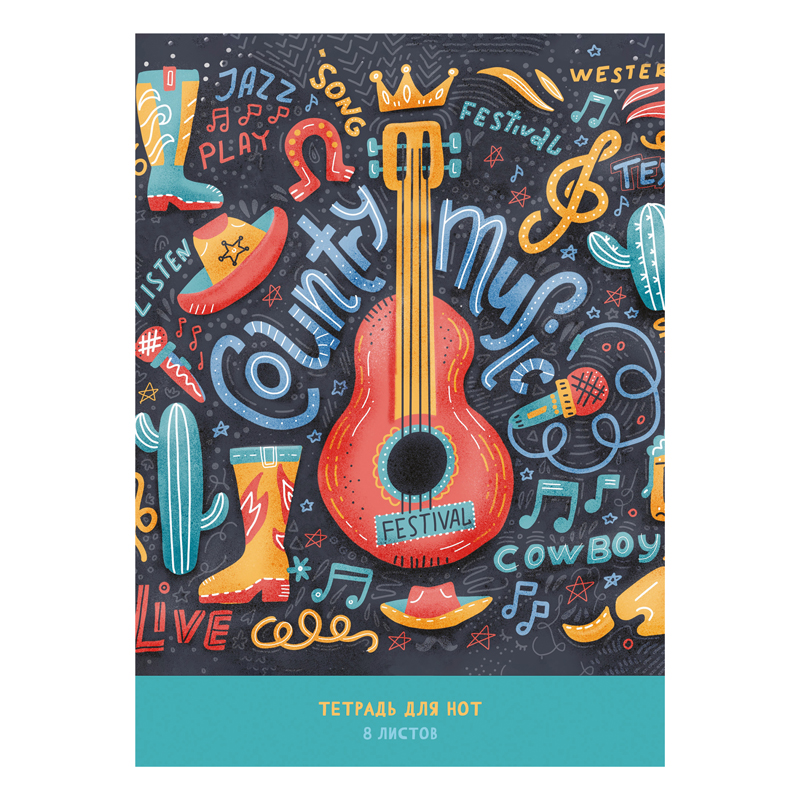 Тетрадь для нот ArtSpace «Веселая гитара» формата А4 (195*270 мм) на скрепке прекрасно подойдёт для записи нот любимых произведений. Тетрадь имеет вертикальную ориентацию. Внутренний блок состоит из 8 листов офсетной бумаги плотностью 65 г/м2 и 100% белизной. Обложка тетради выполнена из качественного целлюлозного мелованного картона. Яркие и интересные обложки тетрадей для нот ArtSpace с различными рисунками понравятся и мальчикам, и девочкам.<br/>• Формат: А4 (195*270 мм);<br/>• Кол-во листов: 8;<br/>• Ориентация: вертикальная;<br/>• Крепление: скрепка;<br/>• Материал обложки: мелованный картон