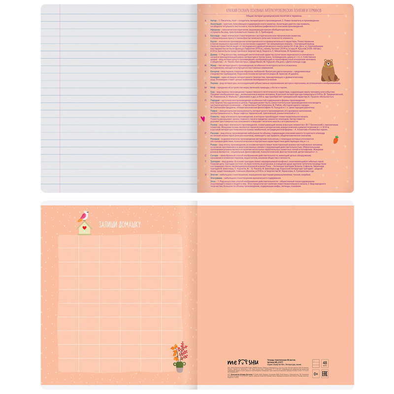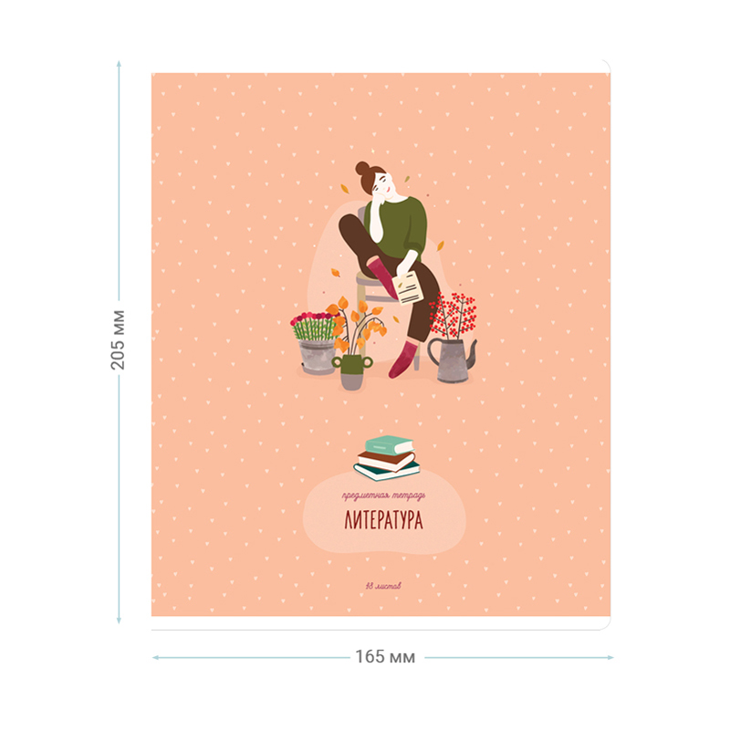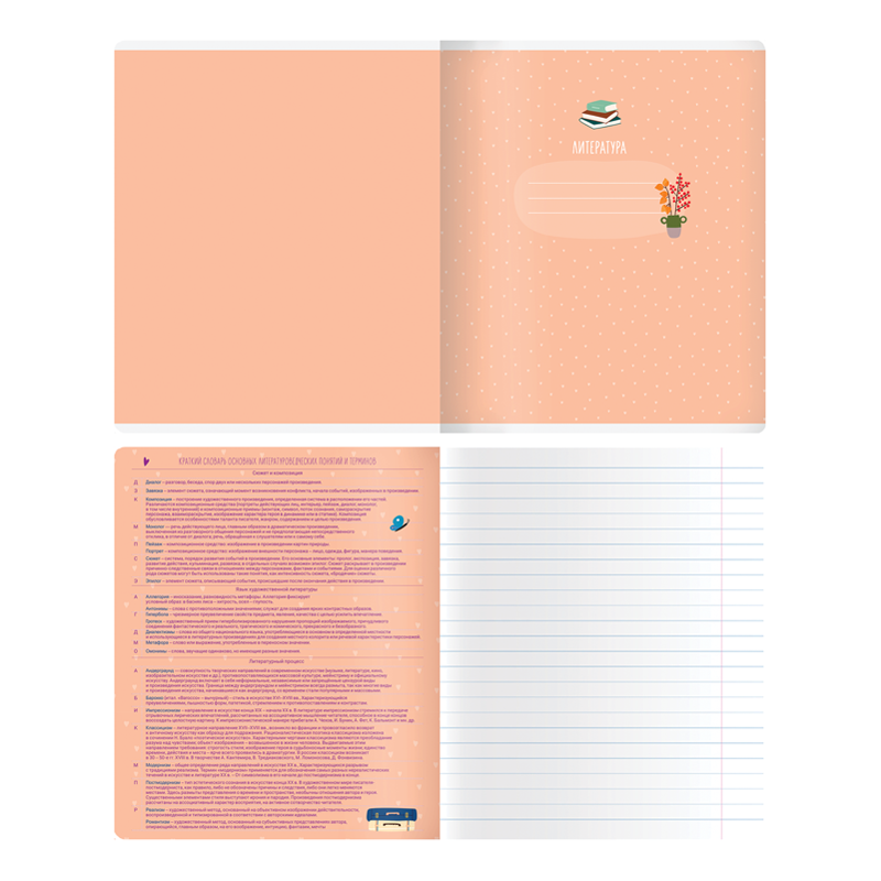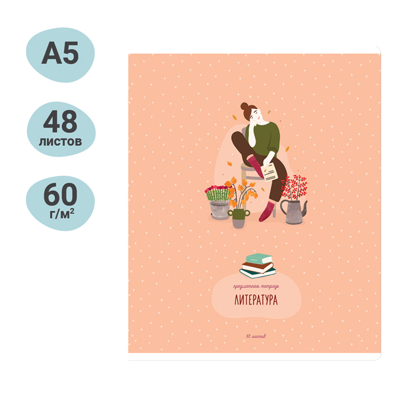 Тетрадь тематическая «Литература» из серии «Study for life» (в серии 10 предметов), со справочным материалом на отдельных листах. Формат А5 (165*205 мм). Вид крепления – скрепка. Внутренний блок – 48 листов, офсет 60 г/м², белизна 100%, линовка – линия с полями. Обложка – целлюлозный картон,с цветной запечаткой форзаца, отделка обложки – ВД-лак. Листы со справочной информацией яркие и являются продолжением дизайна обложки тетради.