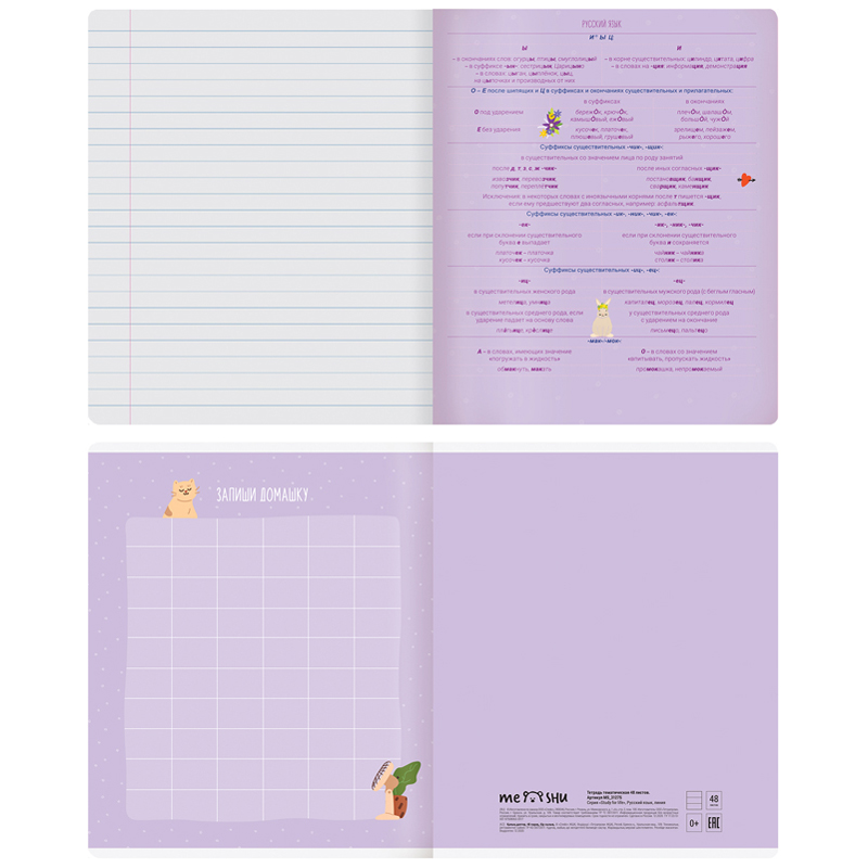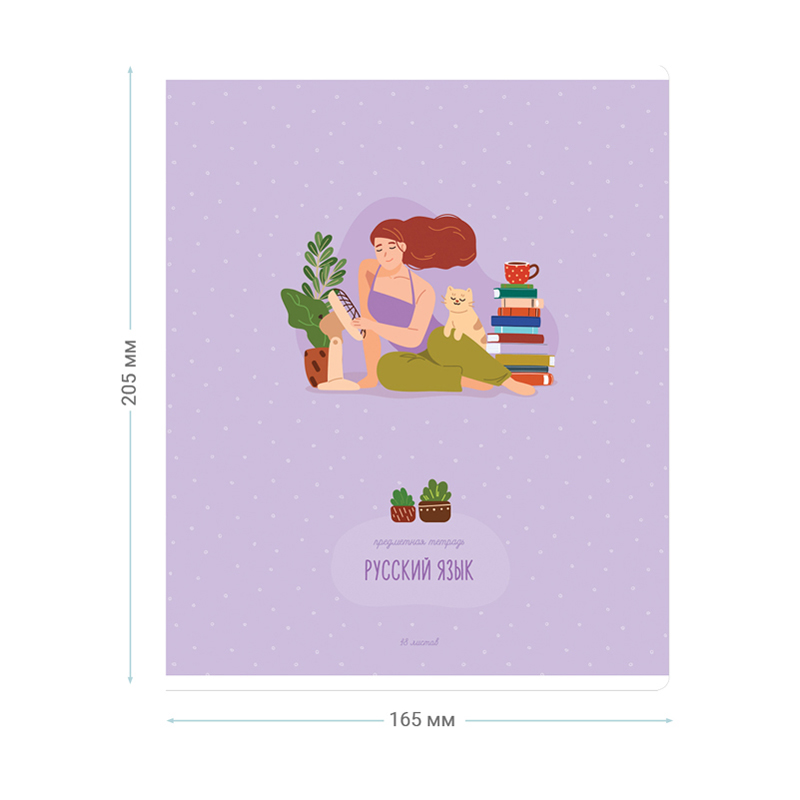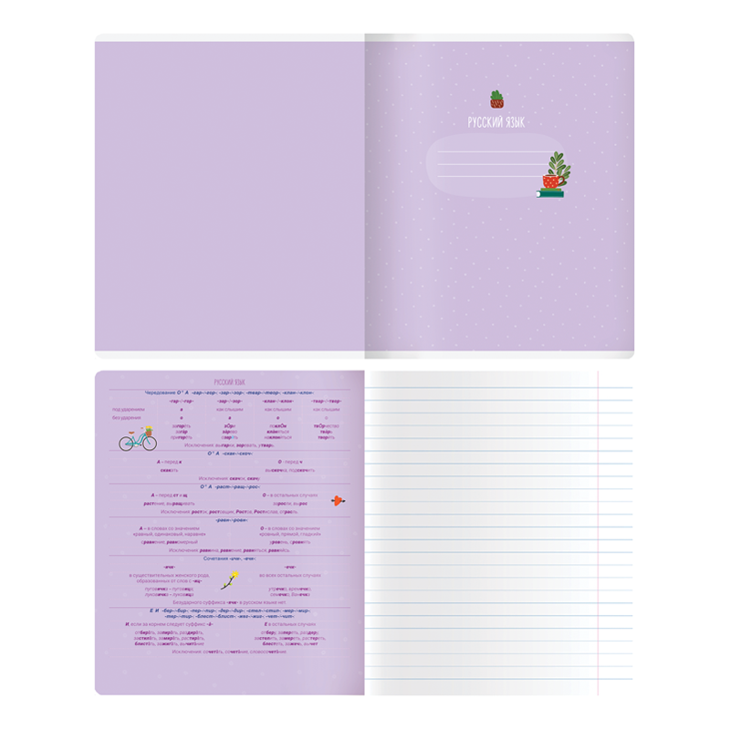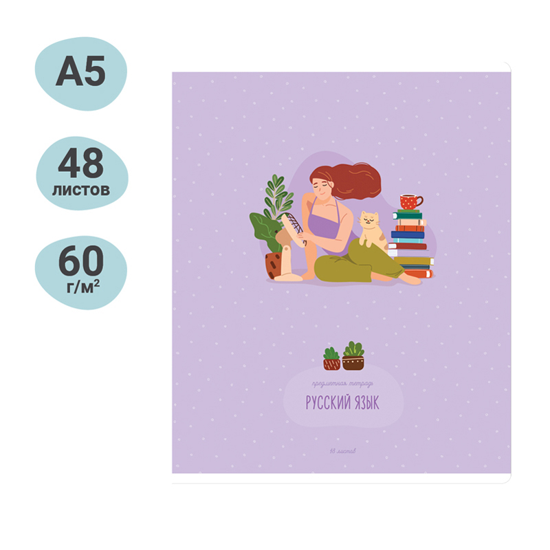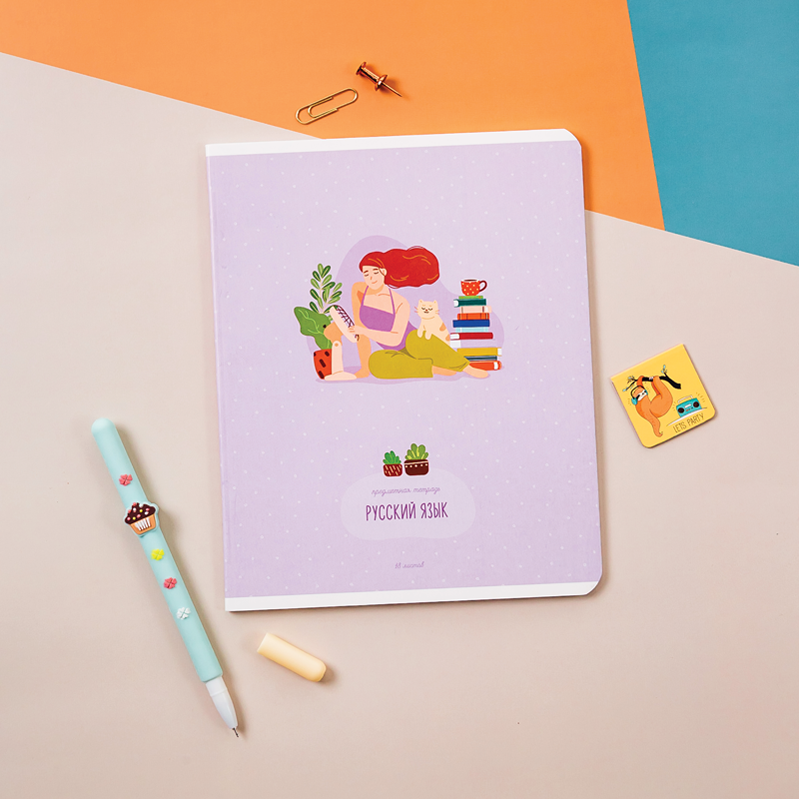 Тетрадь тематическая «Русский язык» из серии «Study for life» (в серии 10 предметов), со справочным материалом на отдельных листах. Формат А5 (165*205 мм). Вид крепления – скрепка. Внутренний блок – 48 листов, офсет 60 г/м², белизна 100%, линовка – линия с полями. Обложка – целлюлозный картон,с цветной запечаткой форзаца, отделка обложки – ВД-лак. Листы со справочной информацией яркие и являются продолжением дизайна обложки тетради.