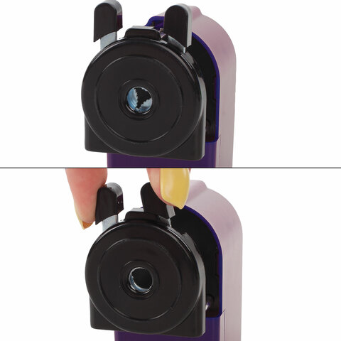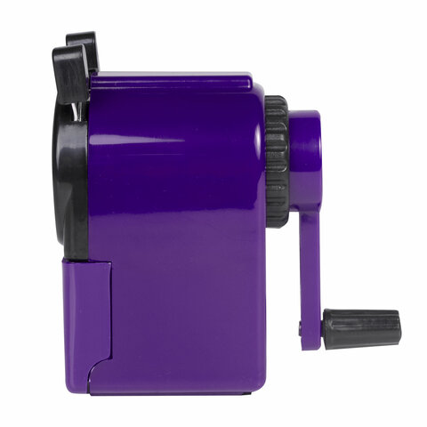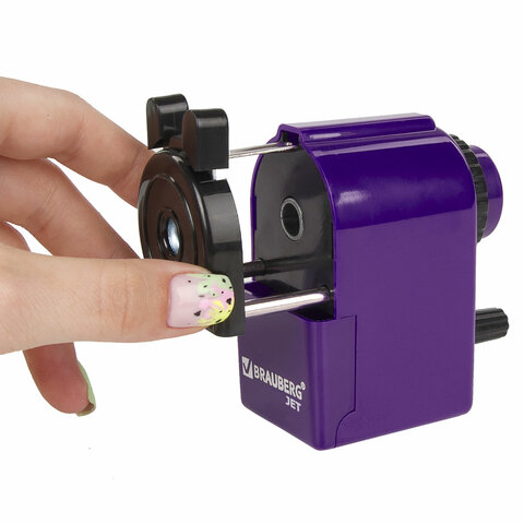 Корпус точилки выполнен из пластика фиолетового и черного цветов. Вращающийся роликовый нож из высококачественной стали обеспечивает быструю и острую заточку. Точилка имеет одно отверстие и вместительный контейнер для сбора стружки. Диаметр затачиваемого карандаша - 8 мм. Размер: 95х45х90 мм.