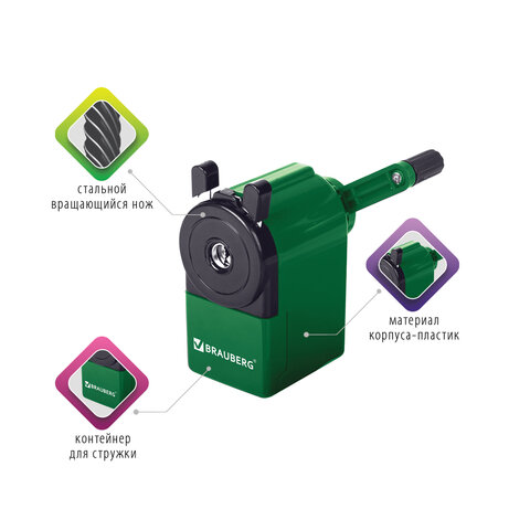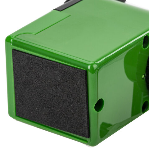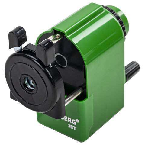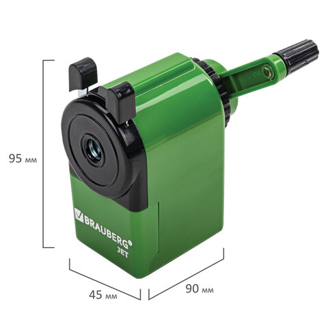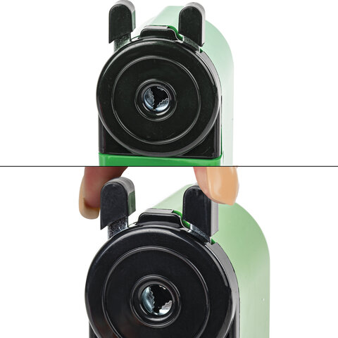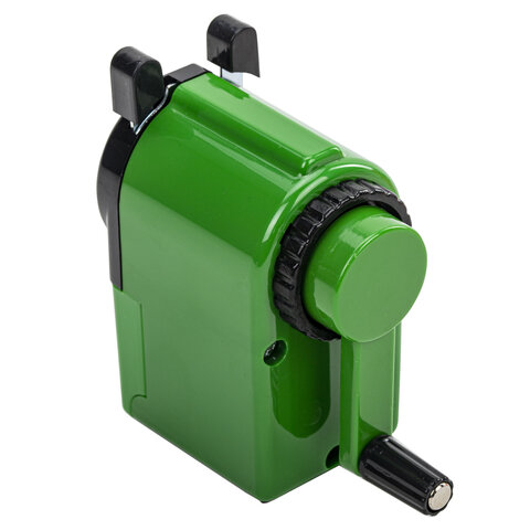 Корпус точилки выполнен из пластика зеленого цвета. Вращающийся роликовый нож из высококачественной стали обеспечивает быструю и острую заточку. Точилка имеет одно отверстие и вместительный контейнер для сбора стружки. Диаметр затачиваемого карандаша - 8 мм. Размер: 95х45х90 мм.