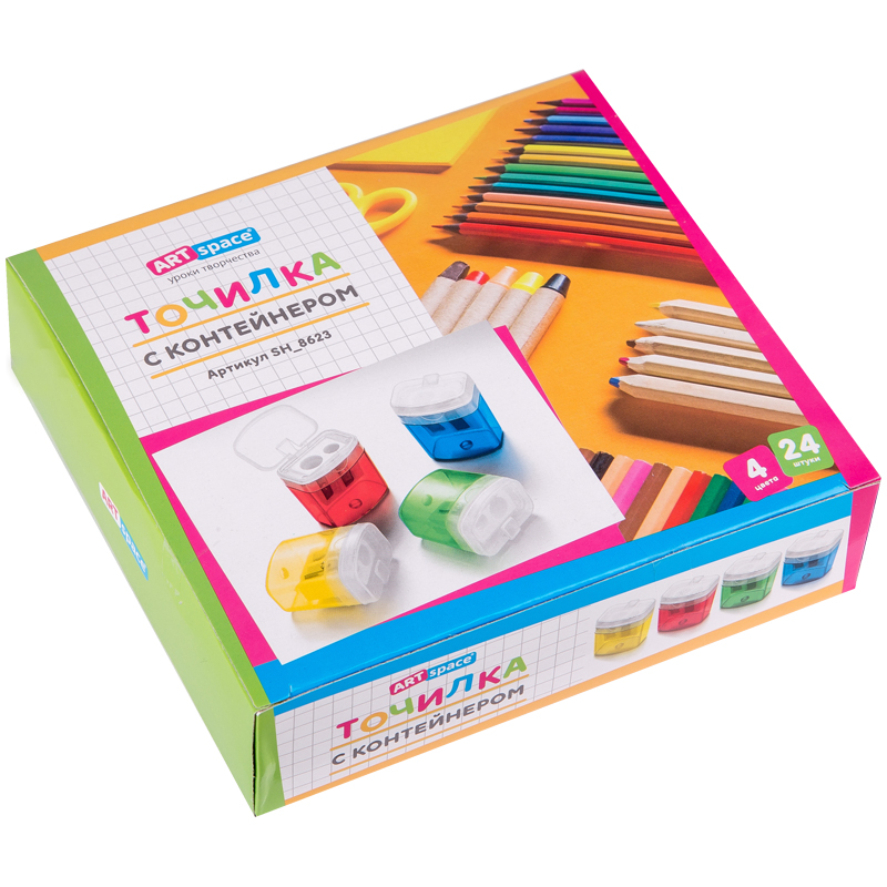 Товар, предназначен для затачивания карандашей. Точилка имеет 2 отверстия, цвета корпуса - ассорти.