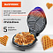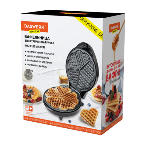 Антипригарное покрытие и встроенный нагревательный элемент мощностью 1200 Вт обеспечивают равномерное приготовление пяти вафель-сердечек одновременно.