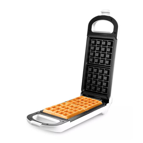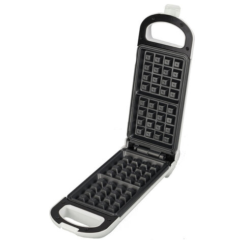 Вафельница оснащена световым индикатором нагрева и независимыми нагревателями в каждой половинке формы. Корпус выполнен из термоустойчивого пластика. Формы покрыты антипригарным покрытием, они быстро нагреваются и обеспечивают равномерное пропекание теста с двух сторон. Зажим может использоваться как для приготовления вафель, так и для удобного хранения вафельницы.