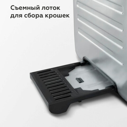 Кнопка отмены позволяет прервать обжаривание в любой момент. Цифровой LED экран с сенсорным управлением обеспечит комфортную и интуитивно понятную эксплуатацию устройства. Кроме того, данный тостер из нержавейки снабжен съемным поддоном для крошек, который обеспечивает безопасность и облегчает уход. Поддон легко выдвигается и очищается.