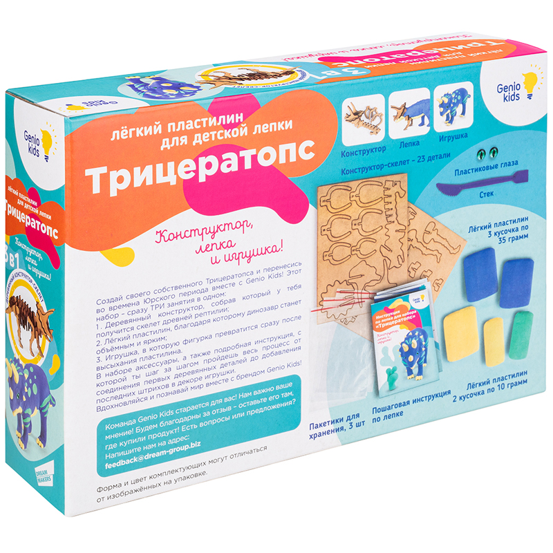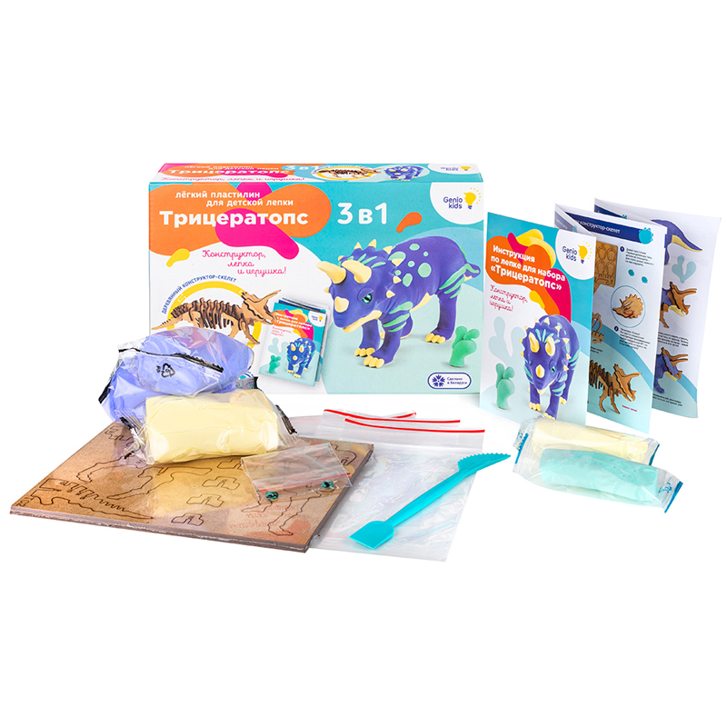 Создай своего собственного динозавра и перенесись во времена Юрского периода вместе с Genio Kids! Этот набор - сразу ТРИ занятия в одном: 1. Деревянный конструктор, собрав который у тебя получится скелет древней рептилии; 2. Лёгкий пластилин, благодаря которому динозавр станет объёмным и ярким; 3. Игрушка, в которую фигурка превратится сразу после высыхания пластилина. В наборе аксессуары, а также подробная инструкция, с которой ты шаг за шагом пройдёшь весь процесс от соединения первых деревянных деталей до добавления последних штрихов в декоре игрушки. Вдохновляйся и познавай мир вместе с Genio Kids!